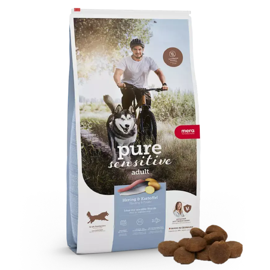 L’alimento secco Mera Pure Sensitive Fresh Meat Aringa e Patate è specificamente indicato per cani con sensibilità digestive. Grazie all’aringa come unica fonte di proteine animali (inclusa una quota di pesce fresco) e all’utilizzo delle patate come fonte di carboidrati, la ricetta è completamente priva di cereali.